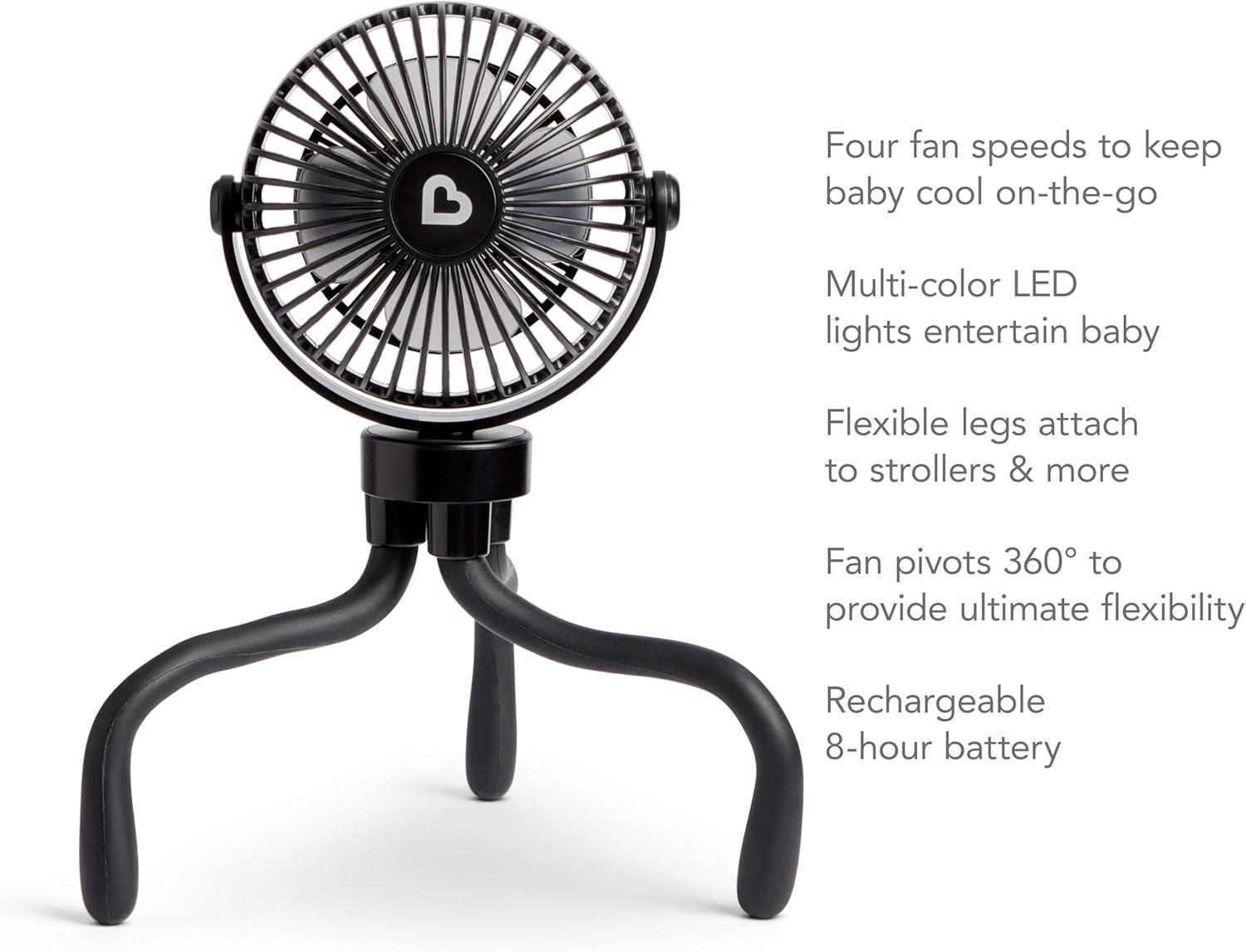 Munchkin Stroller Fan - Portable Fan for Travel, Baby Gear Accessory with 4 Speeds, Flexible Clip-on Leg Attachment, Rechargeable Battery, Black with Multicolored LED Lights(Black)